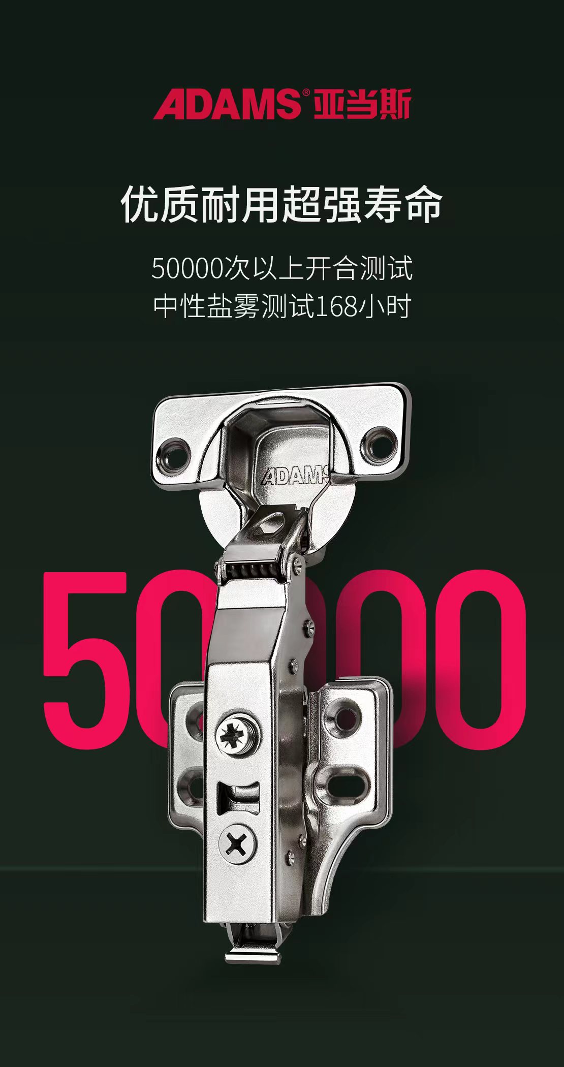 質量鑄就品牌,細微之處見真章。亞當斯變幻王鉸鏈使用碳素鋼電鍍工藝技術,鉸鏈的表面鍍層致密性強、抗銹耐腐性高、無毒又環保,有效地阻擋酸堿腐蝕侵襲,為柜門提供長久的守護。