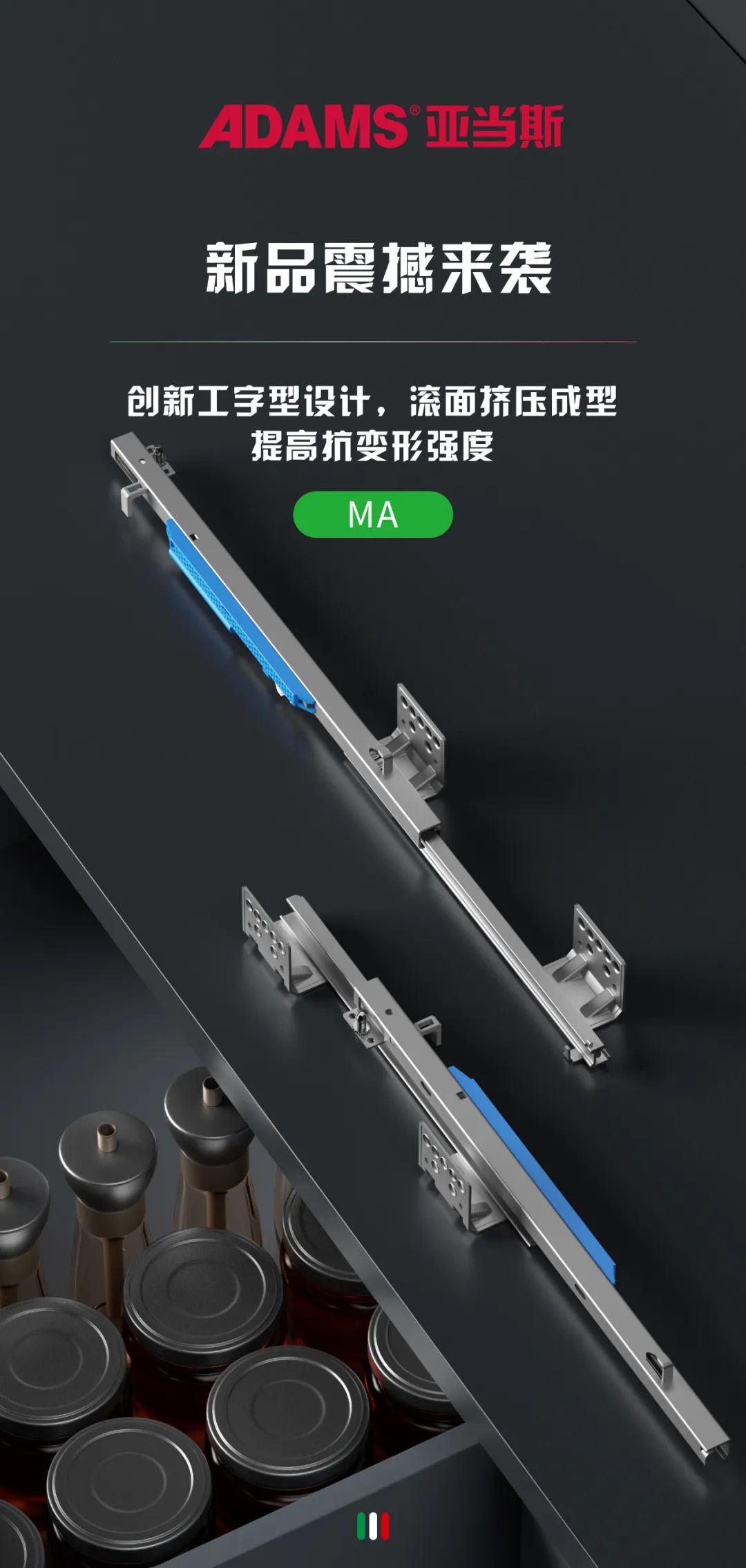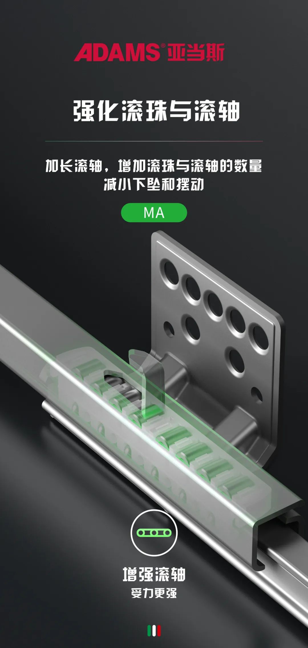 MA系列全拉出兩節(jié)隱藏軌采用創(chuàng)新工字型設計理念,提高整條軌的抗變形強度,滾面擠壓成型,結(jié)構(gòu)厚實,不易下沉,滾球的多維度導向性能,使產(chǎn)品推拉如“絲般順滑。