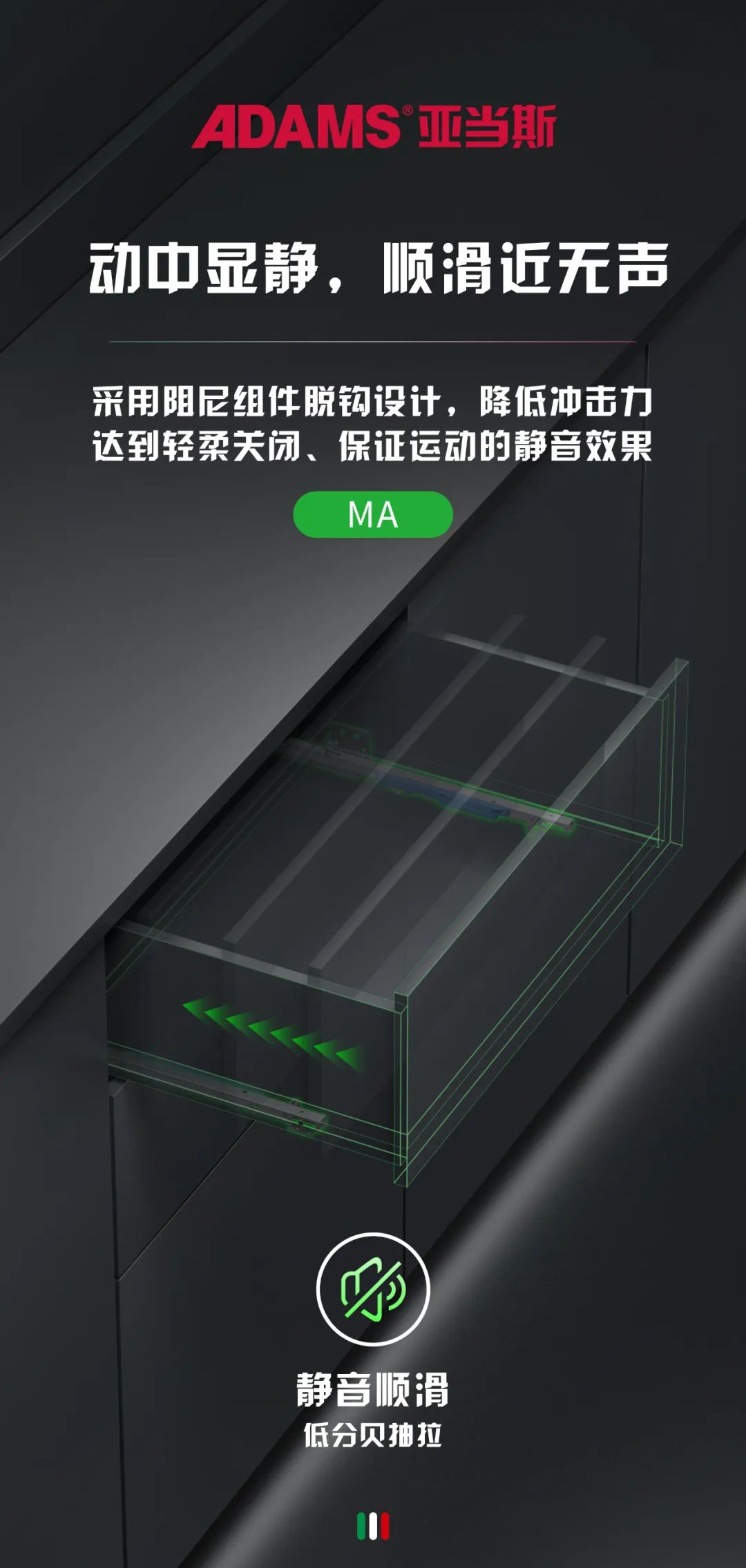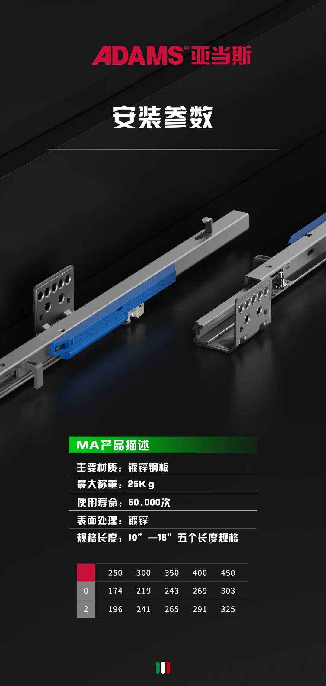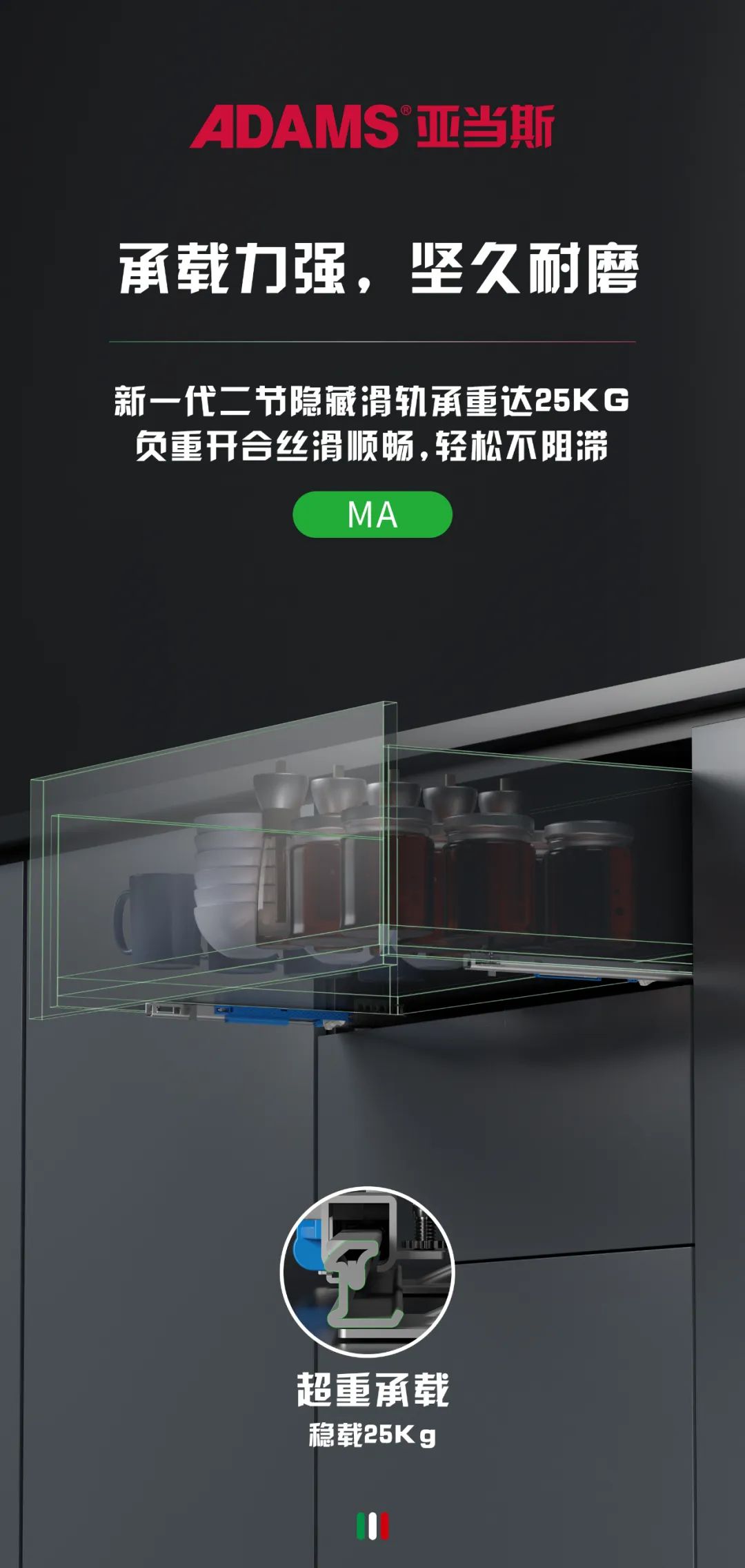 新一代MA系列全拉出二節(jié)隱藏滑軌承重達25KG,推拉輕松順滑,保證滑軌使用壽命。
