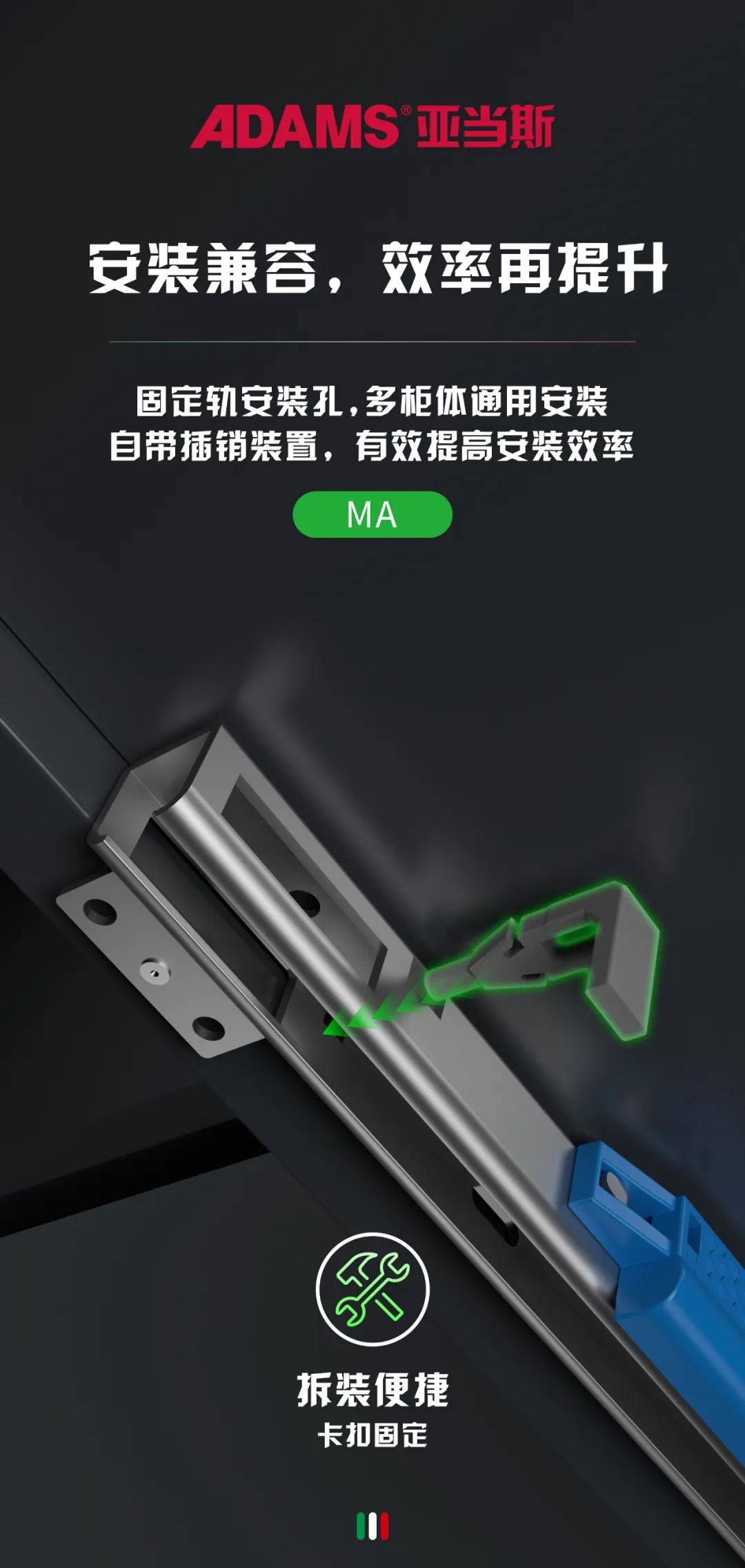固定軌安裝孔科學設計,柜體尺寸兼容性高。產(chǎn)品帶有插銷裝置,輕輕一把,讓您的抽屜自由分離,安裝拆卸都輕松。