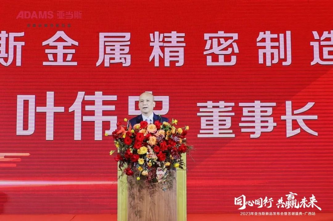 本次會議在亞當斯董事長葉偉忠的致辭中正式拉開帷幕。會議向蒞臨發(fā)布會的領(lǐng)導(dǎo)嘉賓以及來自廣西各地的合作伙伴表示熱烈的歡迎和衷心的感謝。32年來,亞當斯始終秉承誠信經(jīng)營,質(zhì)量至上的理念,與各經(jīng)銷商深化合作,推動協(xié)同發(fā)展走深走實。未來,亞當斯將在產(chǎn)品技術(shù)上精益求精,在銷售渠道上精耕細作,攜手廣大合作伙伴,實現(xiàn)互利共贏、共同發(fā)展。