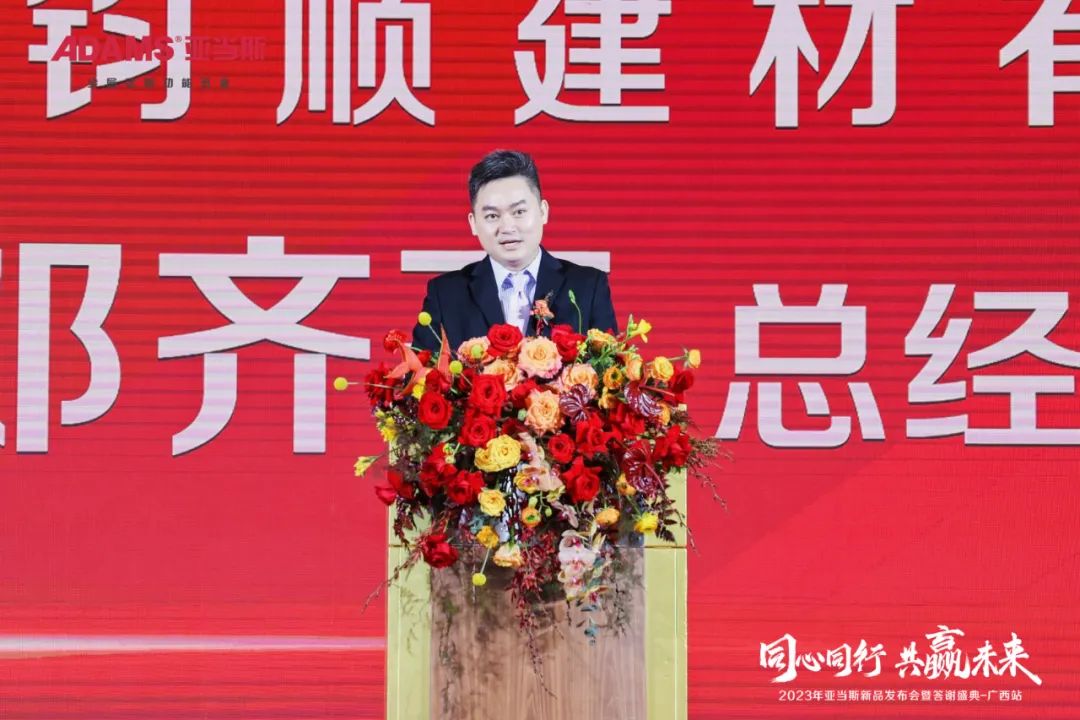 廣西百鈞順建材有限公司總經(jīng)理鄧齊亮發(fā)表講話。鄧總提到,亞當斯作為一家潛力十足技術(shù)創(chuàng)新性企業(yè),以新產(chǎn)品推進新服務(wù),以新模式開拓新市場,必定能與廣大經(jīng)銷商一起突破瓶頸,迎接更美好的未來。