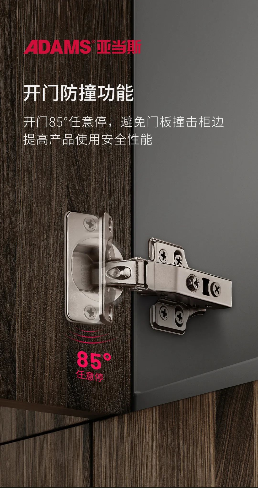 變幻王能實(shí)現(xiàn)柜門(mén)打開(kāi)到85°后,任意定位的功能,消除門(mén)撞擊柜邊物品和自動(dòng)閉合的危險(xiǎn)。