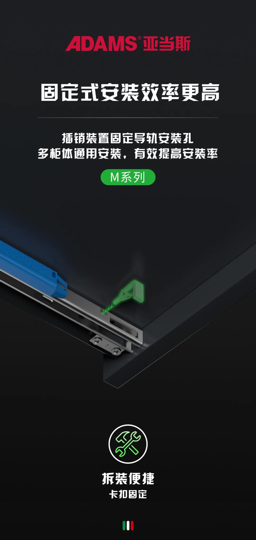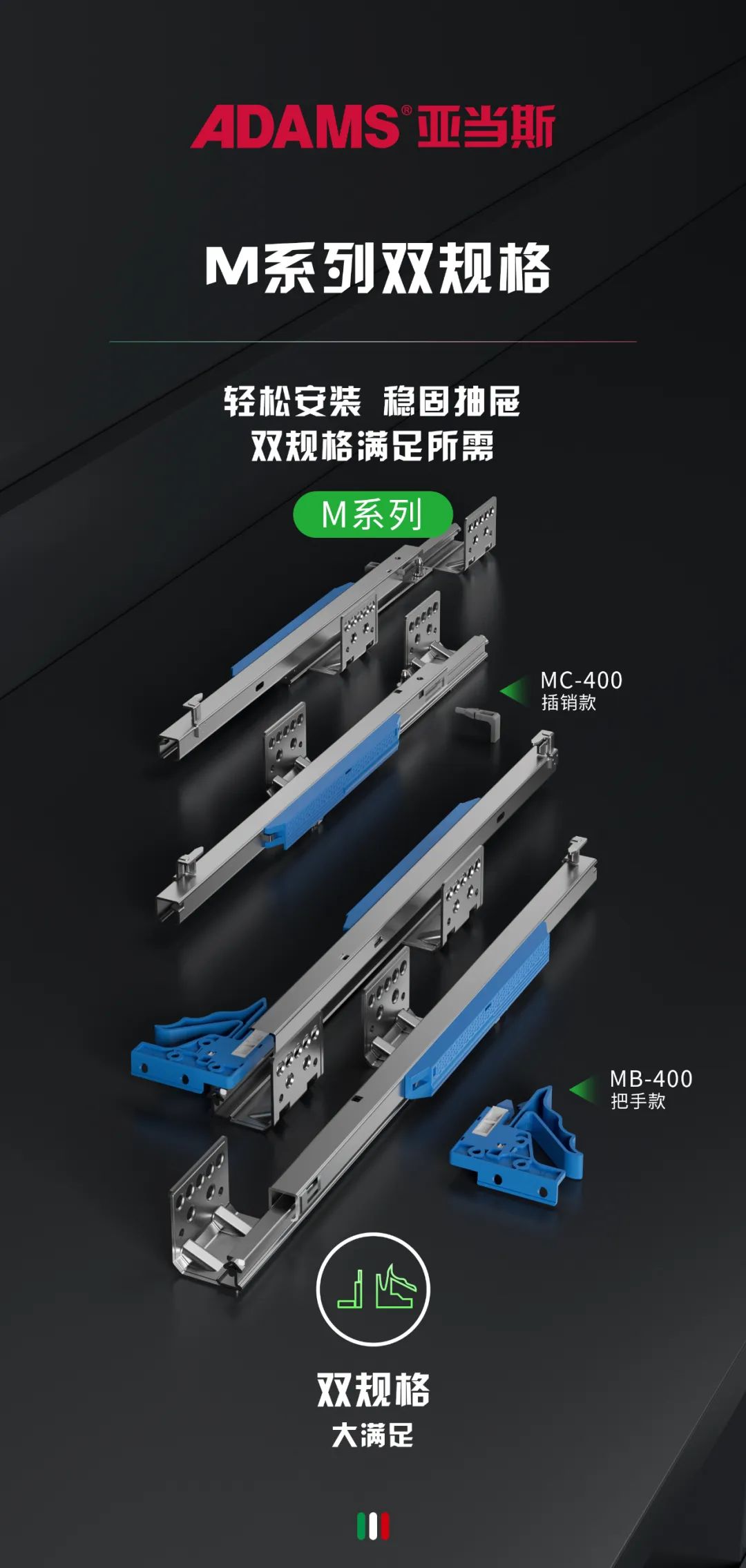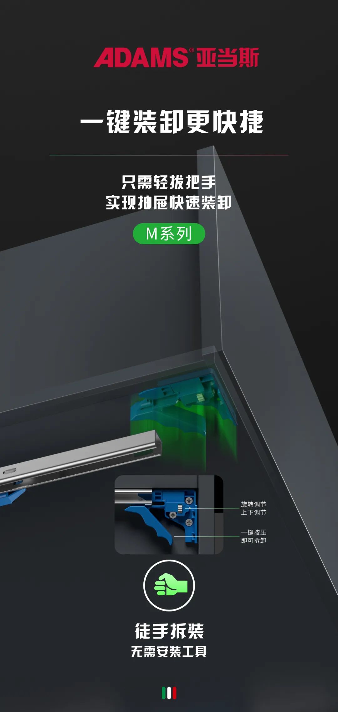 亞當斯M系列二節隱藏滑軌分為:把手款和插銷款,根據家具安裝需求選擇最佳的抽屜搭檔即可,適配多種柜體,裝卸簡單省時提效。