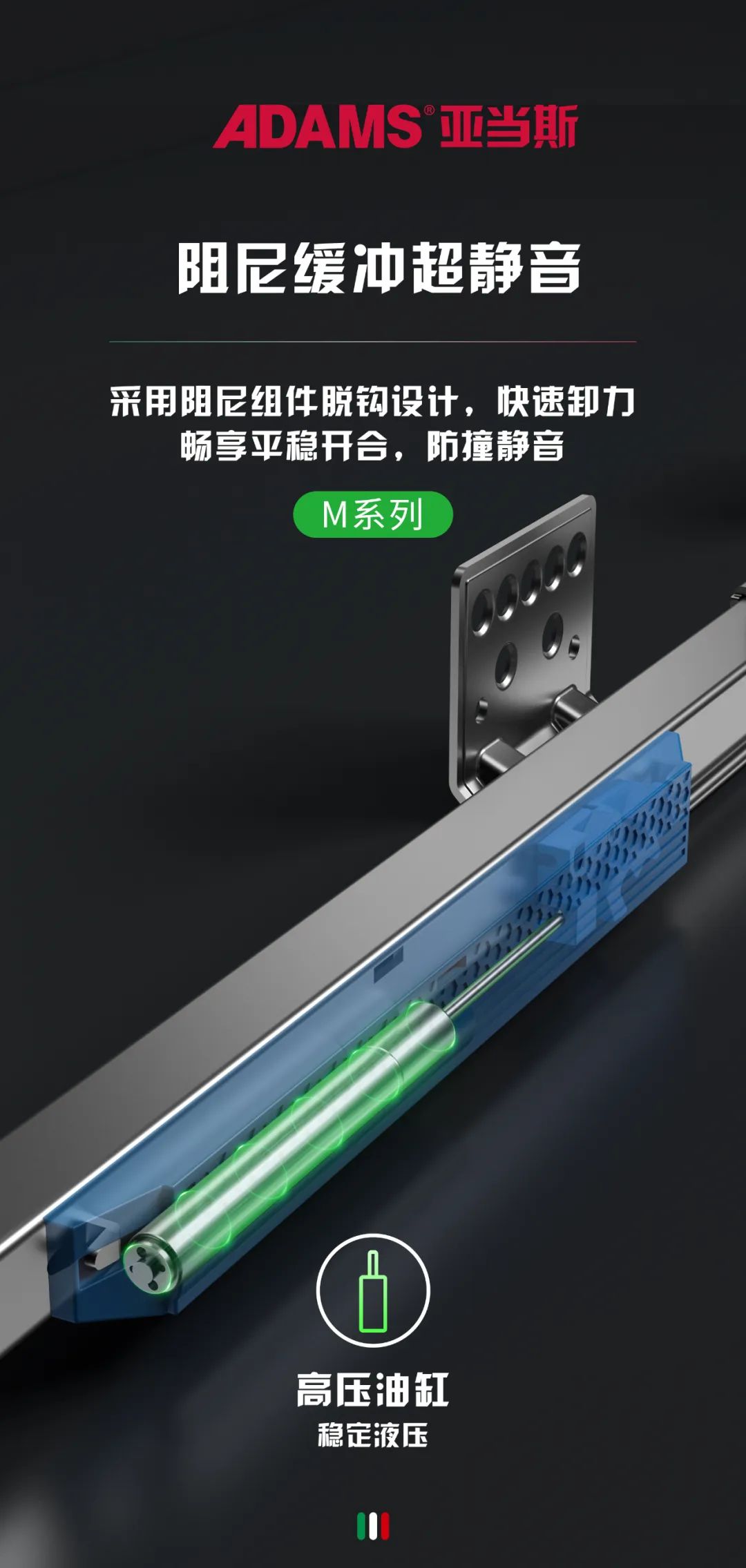 亞當斯M系列二節隱藏滑軌采用高壓油缸、阻尼組件脫鉤設計,運動過程緩沖卸力,防撞耐用兼平穩、無懼卡頓。