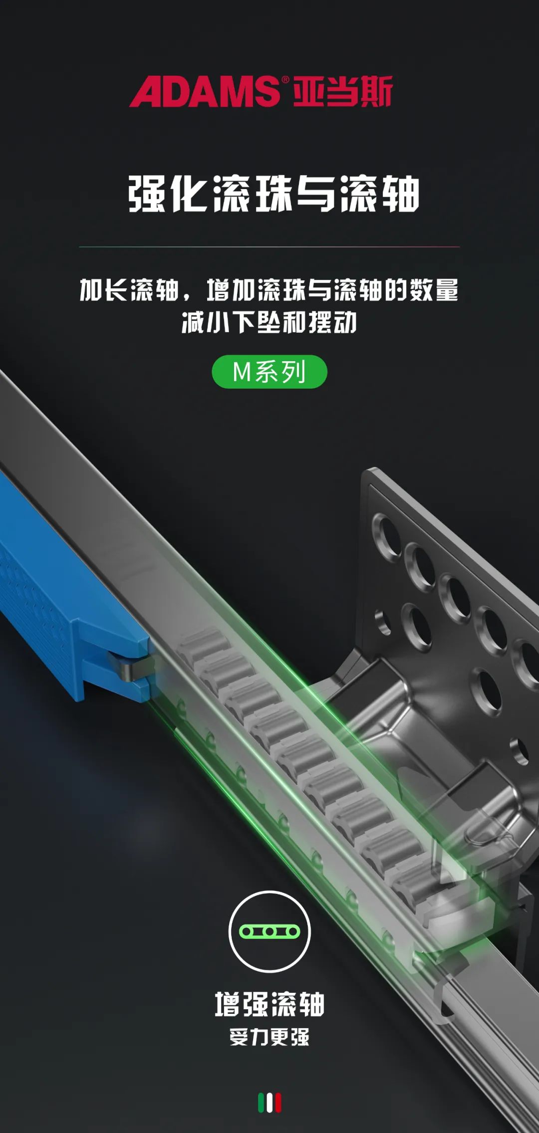 亞當斯M系列二節隱藏滑軌結構加長滾軸,除了防下沉還能減少下墜和擺動,讓滑軌受力更強,輕松應對各類抽屜,展現優秀的水平推拉表現。