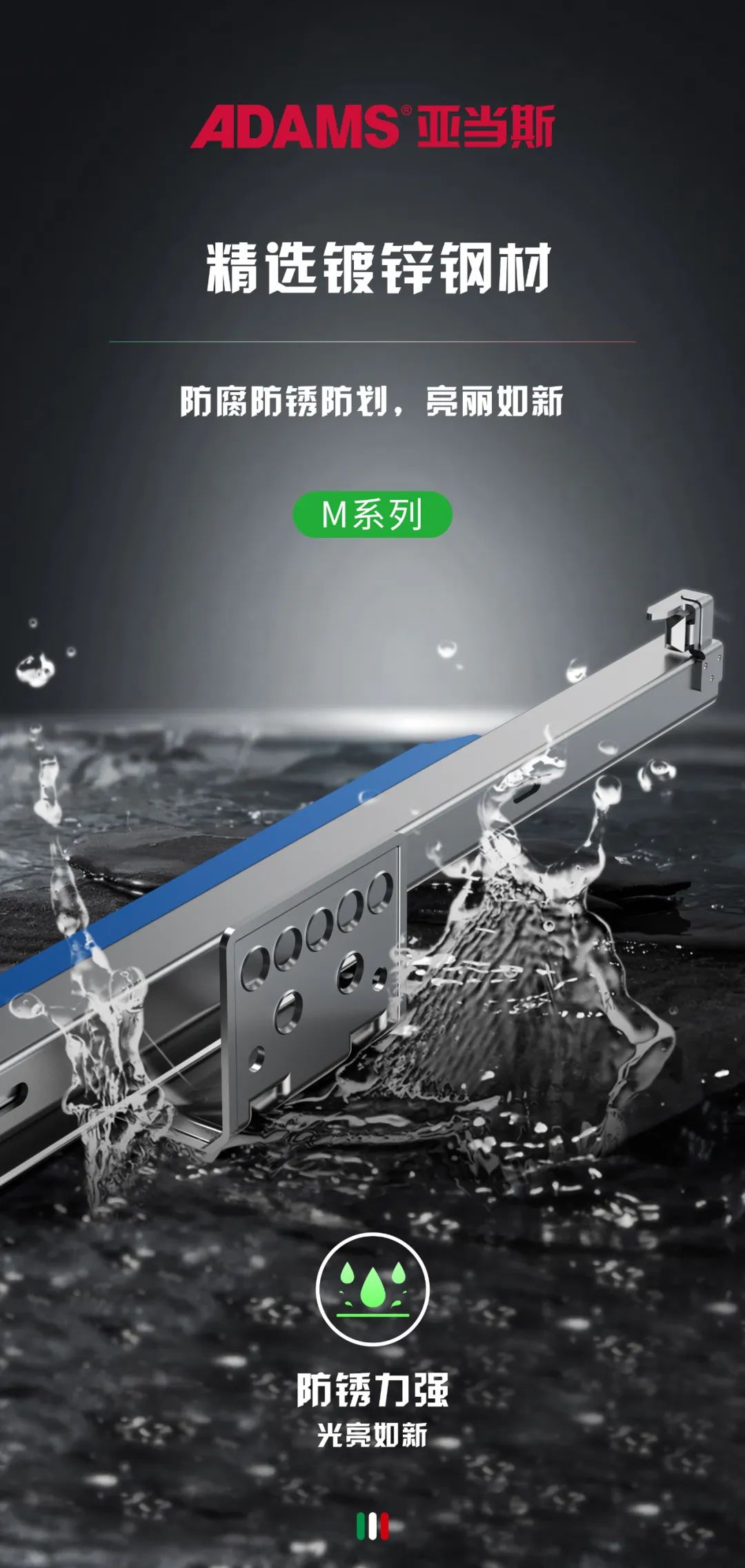 亞當斯M系列二節隱藏滑軌采用精選鍍鋅鋼材,優質材料鑄就堅硬耐磨的性能,每一副滑軌都經過嚴謹的工序打造而成。防腐防銹防劃,在復雜的家居環境也持久耐用。